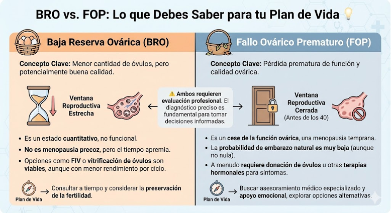 Mientras que la BRO se refiere a la reducción en la cantidad de óvulos, a menudo ligada a la edad, el FOP se refiere al cese total de la función ovárica antes de los 40 años.